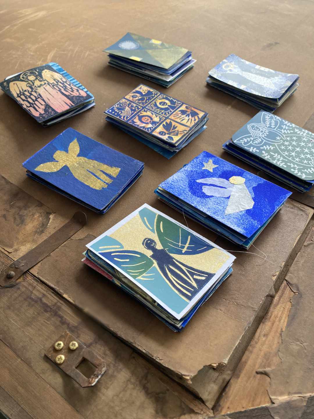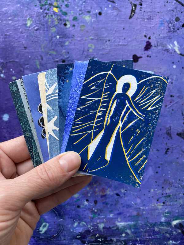 Technik: Mixed-Print Auflage: 24 Stück Format: 64 x 89 mm im Hochformat, im Briefumschlag verschicken Papier: Griffig, hochwertig, stabil Motiv: Engel Farbe: Abstimmung im Zoom-Meeting Umfang: Porto 23 x 0,95 Euro (kann sich durch Auslandspost und Gewicht erhöhen)