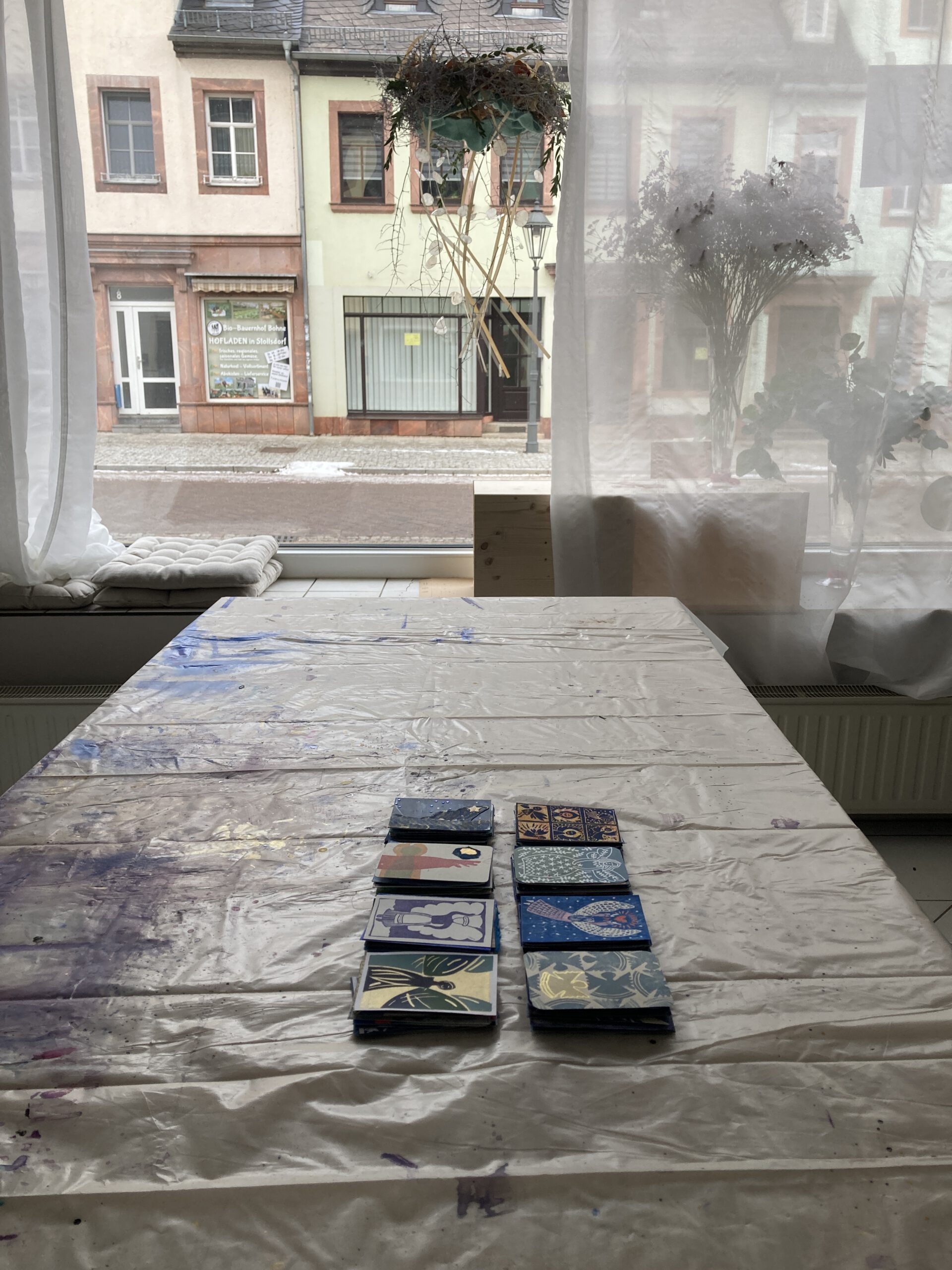 Wir drucken auf einem Papier im Format DIN A5 im Hochformat. Auf dem Hochformat haben wir mehr Möglichkeiten, in die Tiefe zu gehen. Damit du das Druckmotiv gut auf der Druckplatte positionieren kannst, ist es rundherum 1 cm kleiner als A5. Wir berücksichtigen also einen 1 cm Rand. Die Drucke werden mit Bleistift nummeriert, datiert und signiert.