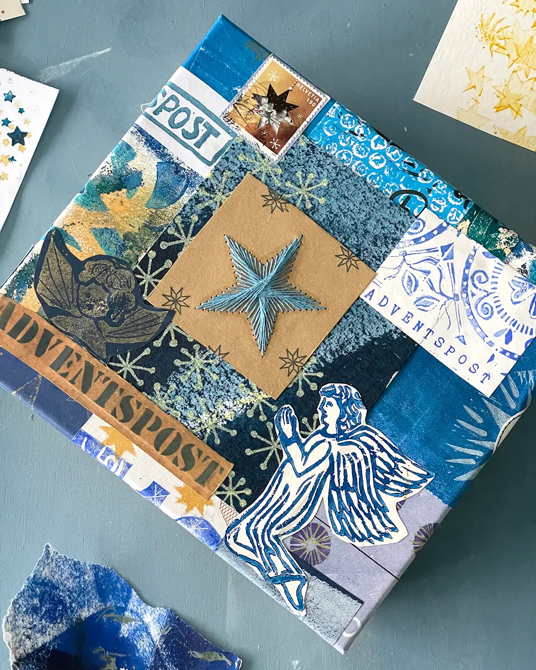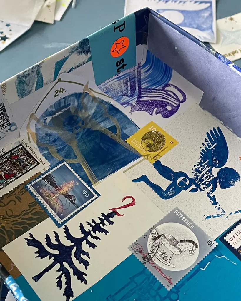 Michaela: Auch von innen habe ich den Deckel der Schachtel beklebt. Dort fanden Briefmarken und weitere Engelschnipsel ihren Platz. Aus Österreich und der Schweiz kamen ja noch sehr schöne Briefmarken. Während es in Dänemark ja gar keinen Briefversand mehr gibt, werden die deutschen Marken auch immer hässlicher. Die Weihnachtsmarken waren ja sogar KI-generiert. Ich habe mich bei der Post geweigert, sie zu kaufen und wurde ausgelacht. Da lobe ich mir die kreative Idee mit dem Portocode rechts. Werden Briefmarken bald so aussehen? Und wie lange werden wir noch analoge Post verschicken?