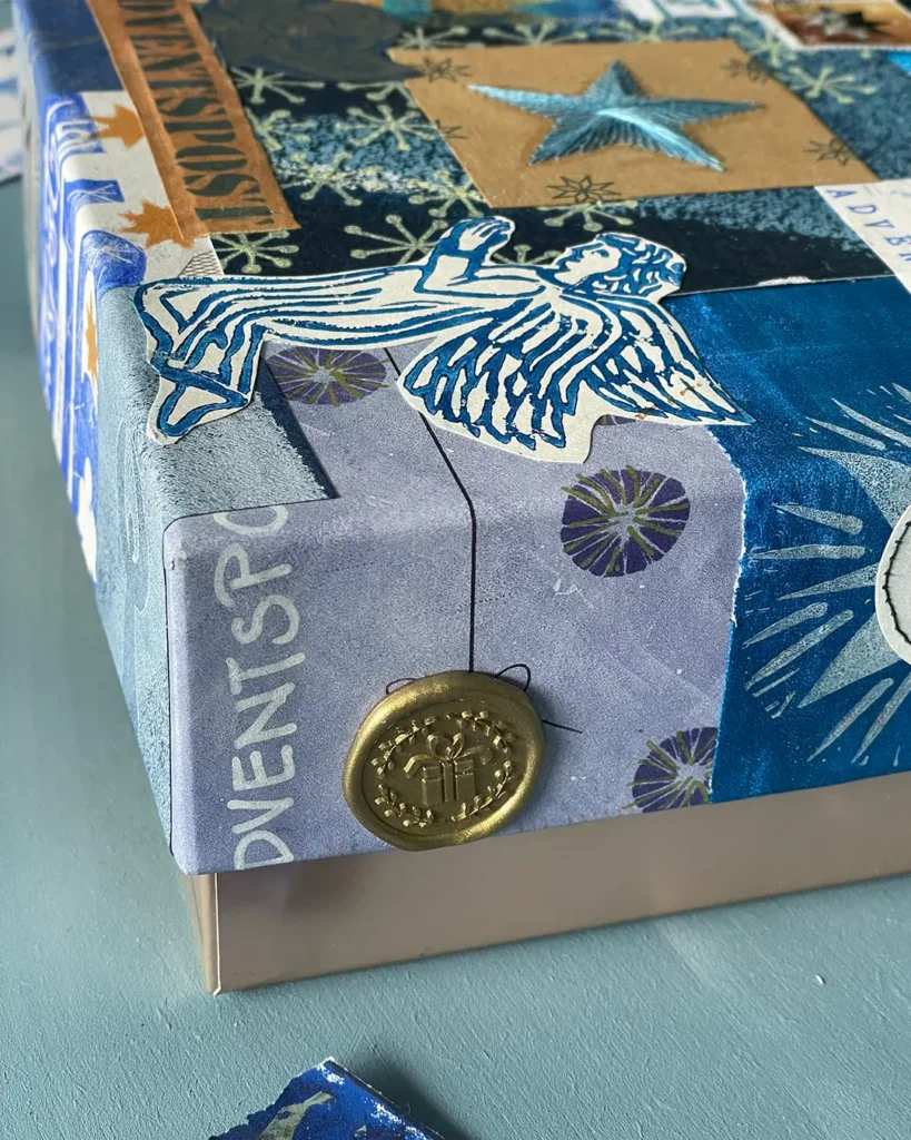 Michaela: Eigentlich hatte ich vor, eine neue Schachtel passend für die Karten zu bauen und mit den Schnipseln zu bekleben. Aber die fertige Stülpschachtel, die ich zum Zwischenlagern benutzt hatte, passte auch sehr gut, besonders da der untere Teil mit einem goldenen Papier bezogen ist. So habe ich die schönsten Schnipsel auf dem Deckel der Box zu einer Collage zusammengeklebt. Schau mal, diese besonderen Details: Ein gestickter Stern, ein goldenes Siegel!