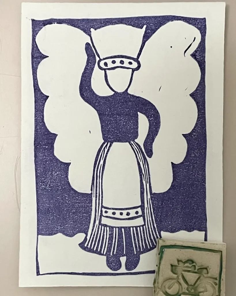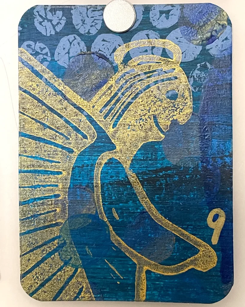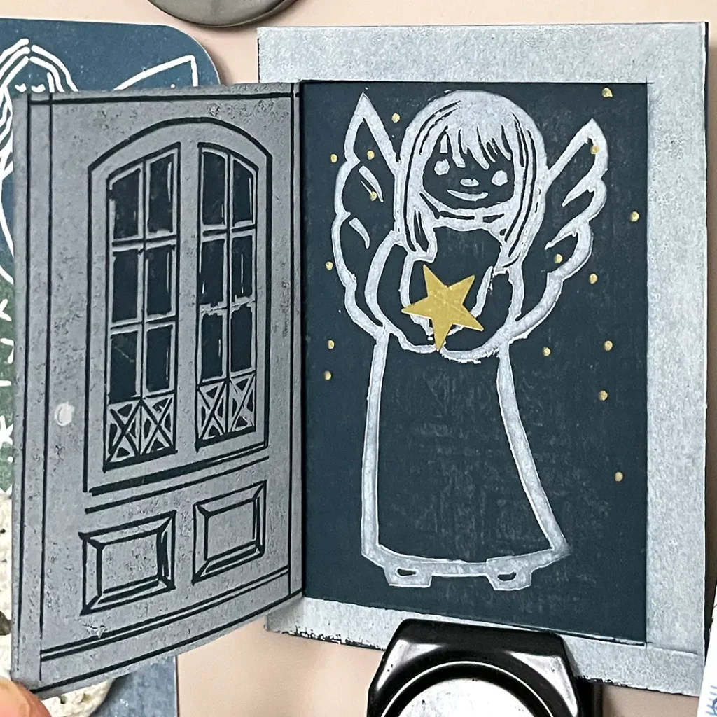 Tabea: Werfen wir einen genaueren Blick auf die Engel. Das Motiv war weit gefasst, wir suchten nicht ausschließlich den christlichen Engel. Willkommen waren alle Engelskreaturen, selbsterdacht oder aus anderen Kulturen stammend. Die künstlerischen Interpretationen gehen von klassischen, illustrativen Engeln, bis hin zu sehr abstrakten, eigensinnigen Wesen. Komplexe und detailreiche Drucke finden sich neben intuitiven Mark Making Lösungen. Denn unser Spektrum ließ dies zu, der Mixed-Print wurde vielseitig und ideenreich angewandt und das Nachtblau hat alle Drucke miteinander verbunden.