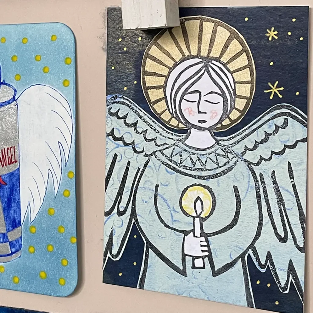 Ein gemeinsames Motiv verbindet unsere ATC´s. Unser Motiv wirkt auf den ersten Blick sehr weihnachtlich und passt gut in unsere Adventszeit. Besonders durch die große Auswahl an Techniken versprechen wir uns Vielfalt. »Mixed Print« bringt es auf den Punkt, durch die individuellen Darstellungsmöglichkeiten kann jede ihre eigene Auffassung eines Engels visualisieren. Möchtest du es aus der christlichen Tradition heraus betrachten? Dann ist der Engel ein Bote Gottes, eine geflügelte Lichtgestalt, die zwischen Himmel und Erde vermittelt.