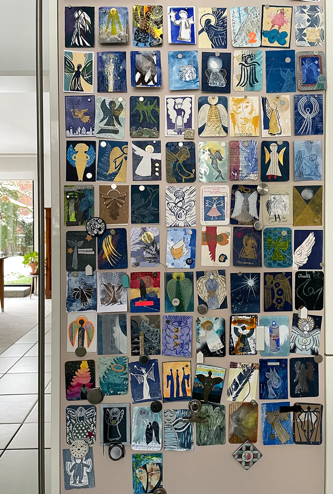 Tabea: Meine Magnetwand hat sich dieses Jahr sehr bewährt! Alle ATC-Engelchen fanden ihren Platz. Über 24 Tage sammelten sich immer mehr Lichtboten, die aus ganz Deutschland – und sogar einigen fernen Ländern – herbeigeflogen kamen.
