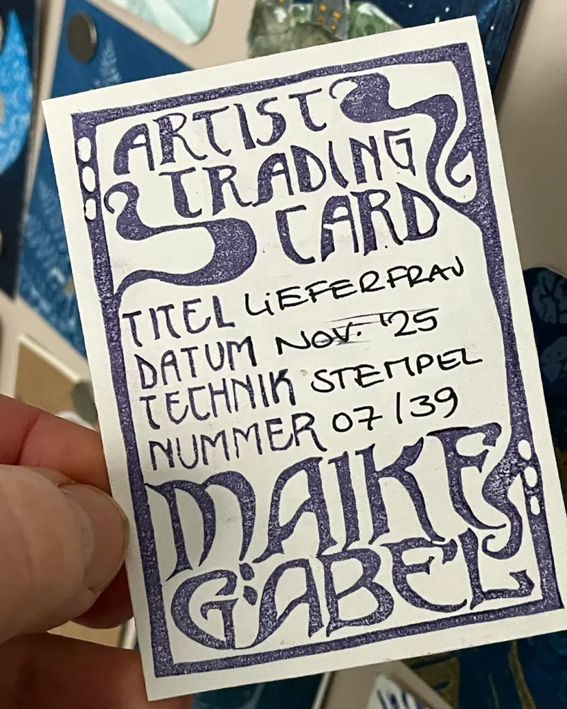 Zur Adventspost 2025 gestalten wir zum ersten Mal seit langer Zeit keine Postkarten, sondern Artist Trading Cards und schicken sie uns einander im Umschlag zu. Viele Kreative sind diesen keinen Unikat-Kärtchen schon begegnet, die gern in Serie gestaltet werden, um sie zu tauschen oder zu verschenken. Vor fast 30 Jahren kam der Schweizer Künstler M. Vänçi Stirnemann auf die Idee, in Spielkartenformat Kunstwerke zu kreieren, sie auszustellen und schließlich einzutauschen.